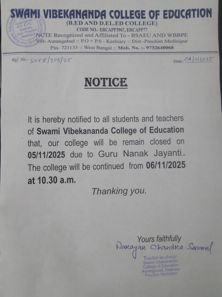 Warm greetings to you on behalf of Swami Vivekananda College . I am extremely glad to share with you all that we are very much confident to create a unique teacher training institution. Our college is approved by NCTE, New Delhi and affiliated to The west Bengal University of Teachers’ Training, Education Planning and Administration (WBUTTEPA). Our institution offers both B.ED and D.EL.ED course in the following subjects like Bengali, English, Mathematics, Physical Science, Biological Science .....