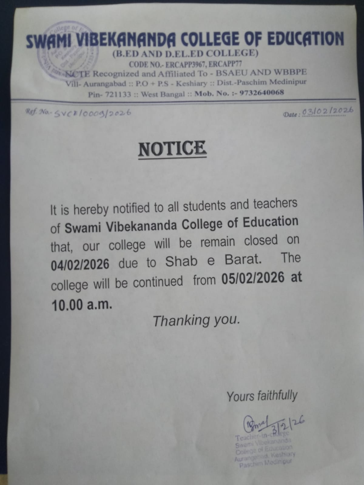 SWAMI VIBEKANANDA COLLEGE OF EDUCATION located at BELDA,PASCHIM MEDINIPORE with full accommodation and up grated infrastructure.